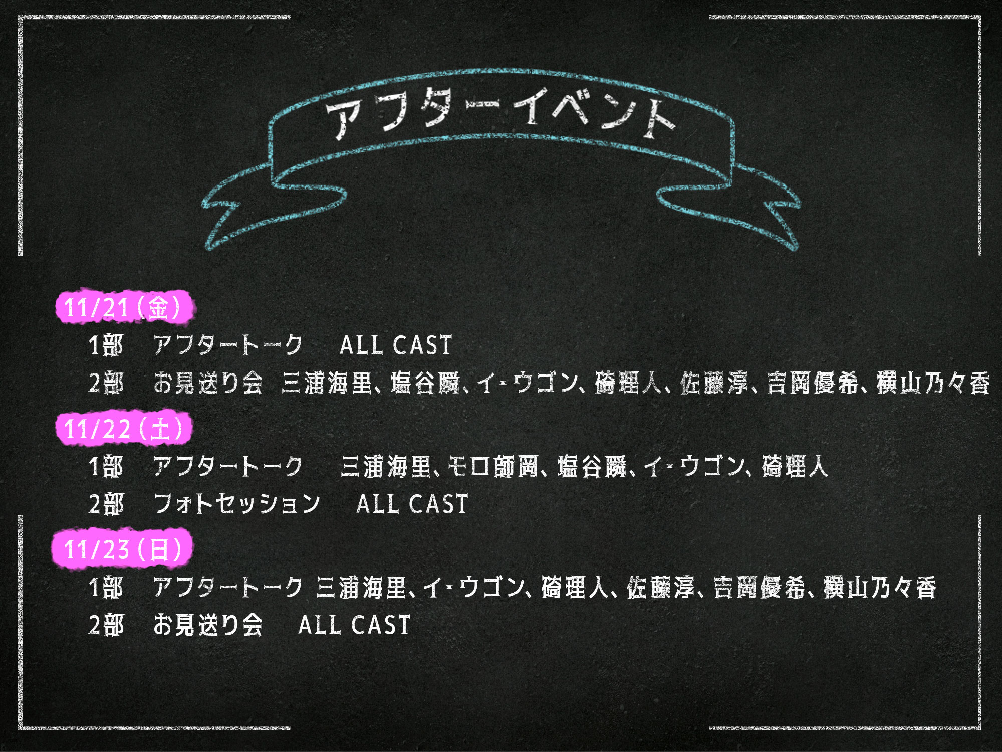 ♦ 11/21(金) 【1部】開場 14:15/開演 15:00 【2部】開場 18:15/開演 19:00 ♦ 11/22(土)・23(日) 【1部】開場 12:45/開演 13:30 【2部】開場 16:45/開演 17:30 ♦ 11/24(月・祝) 【1部】開場 11:45/開演 12:30 【2部】開場 15:45/開演 16:30 |