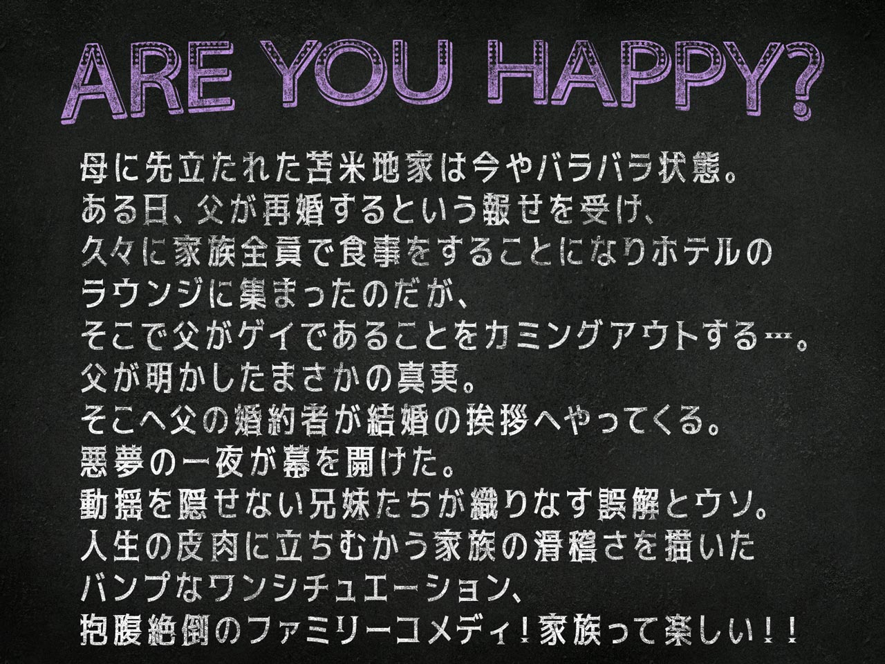 再婚相手を紹介するつもりの父親が、思わぬタイミングで自分が同性愛者であることをカミングアウトしたことから、子供たちは大騒ぎ。勘違い、偶然、そして家族間のいろんな秘密や想いが交錯する中で、苫米地家の人々は、それぞれの思いをぶつけ合いながらも、家族ならではの感情でお互いの心を理解していきます。