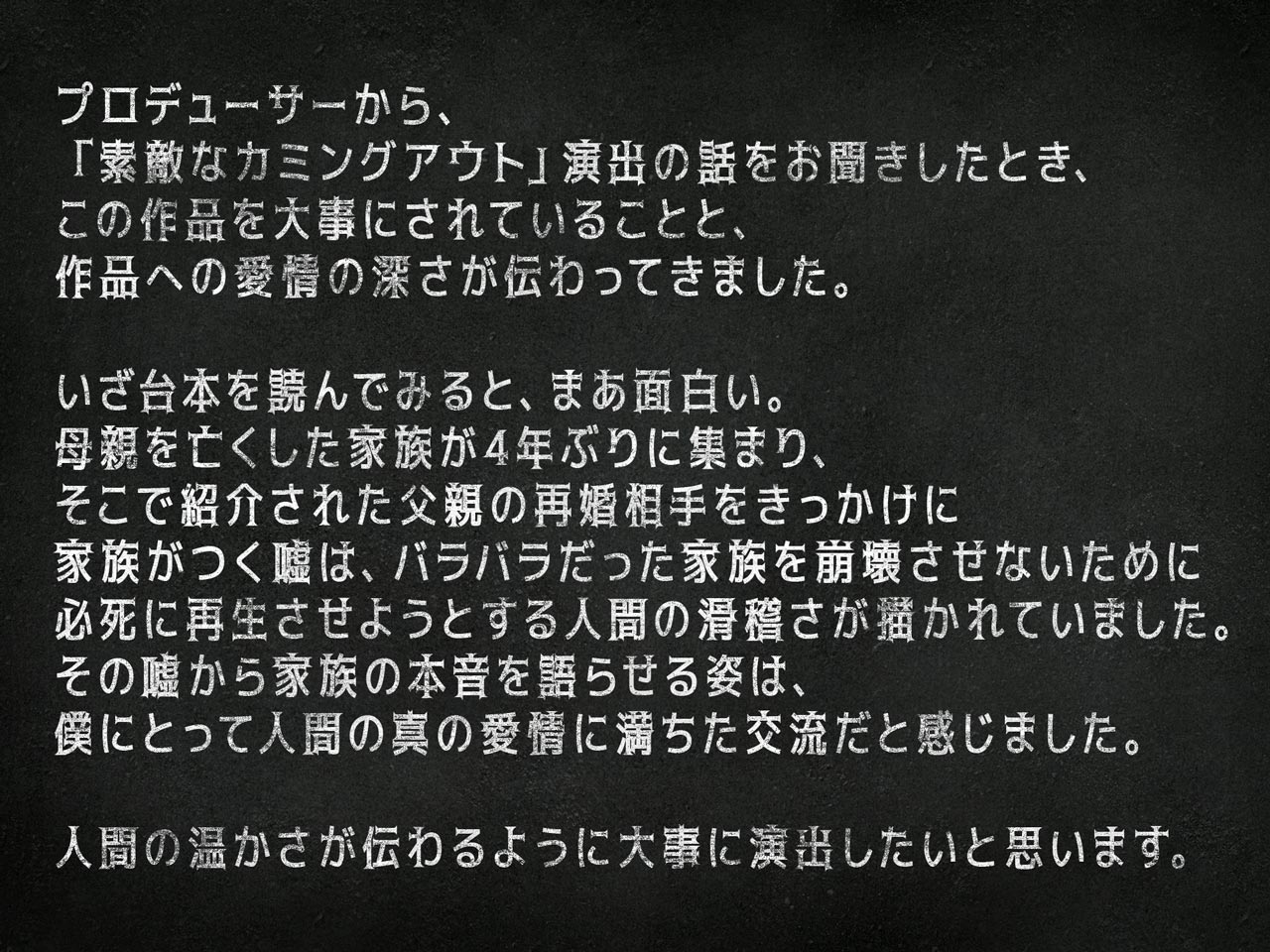 本作、『素敵なカミングアウト』は、家族間での誤解と心のすれ違いが引き起こす笑いの中に、誰もが持つ「愛」や「理解」の不完全さを個性的なキャラクターが、テンポよく展開し、最終的に心を通わせていくストーリーです。この作品を通して、普段は言葉にできない思いを感じ、観劇後はきっと自分自身を見つめ直したり、家族に対しての温かい感情を再確認できる笑いあり、涙ありの感動コメディです。