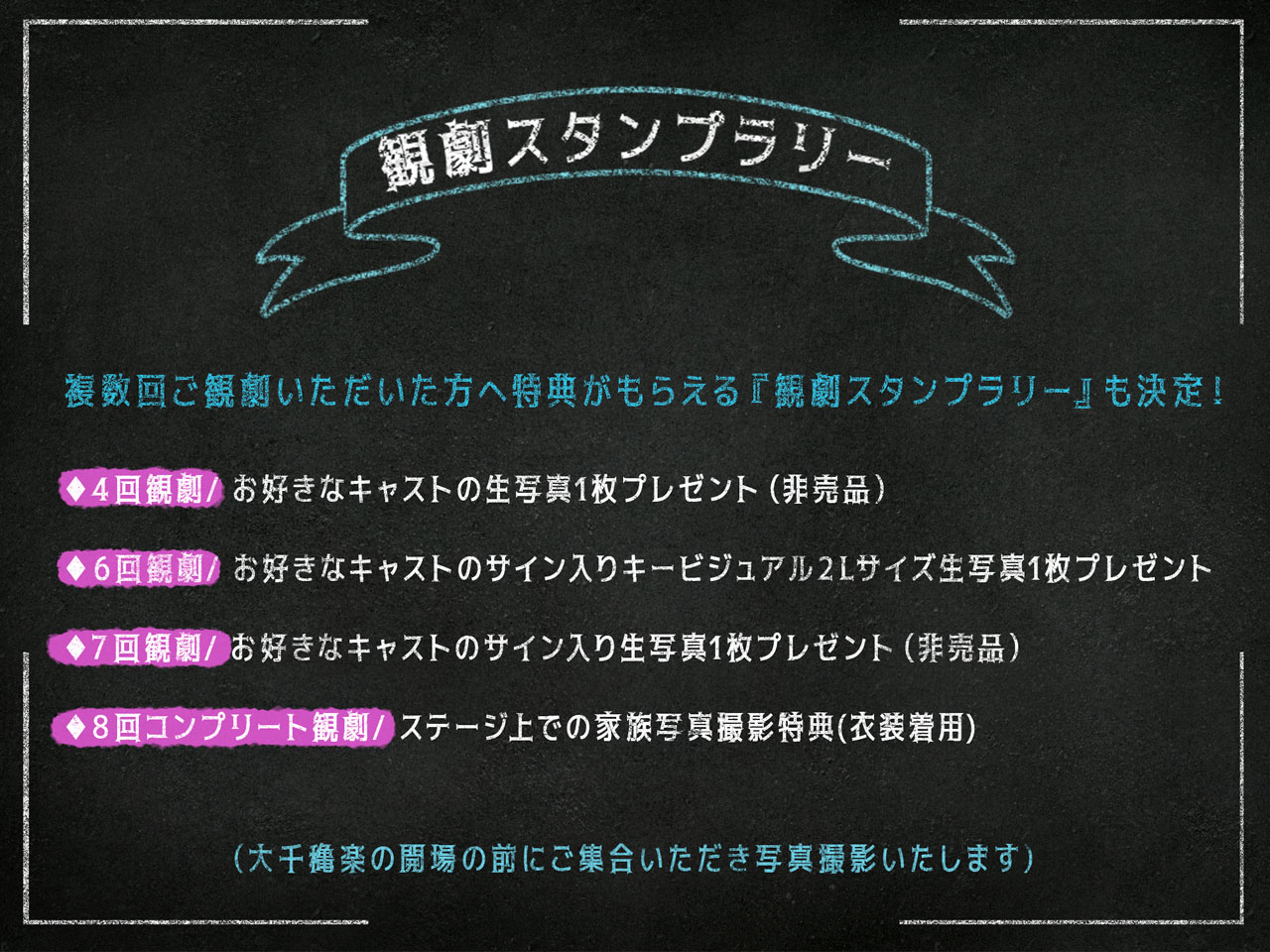 • 劇場周辺での出演者の入り待ち、出待ちは禁止とさせていただいております。